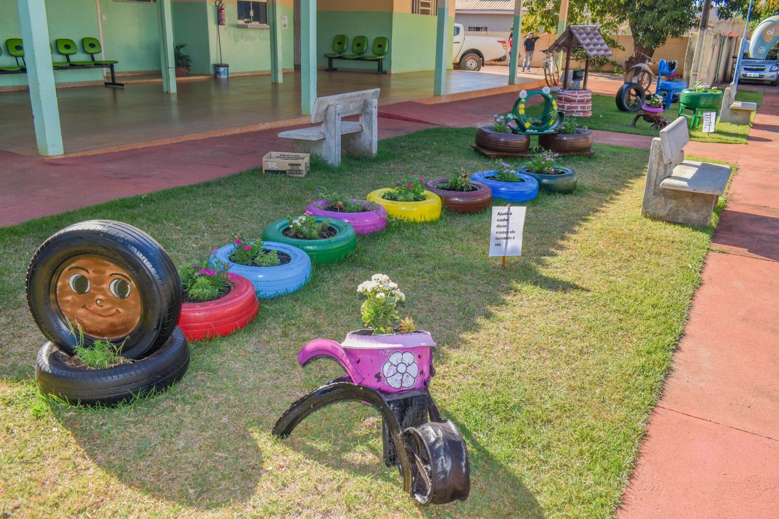 Na frente do Postinho, que fica ao lado do DETRAN, os pneus se transformaram em um jardim colorido, pintados e cheios de flores. Já nas unidades de saúde, passaram a ser usados em hortas medicinais, mostrando que é possível reutilizar o material de forma sustentável.